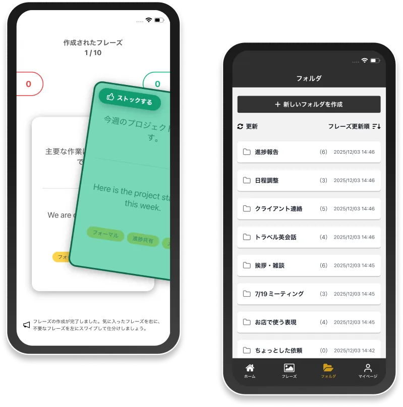 生成されたフレーズをスワイプで「選別」し、フォルダに「整理」。「その場限りの情報」を、あなただけの「学習資産」として構築します。