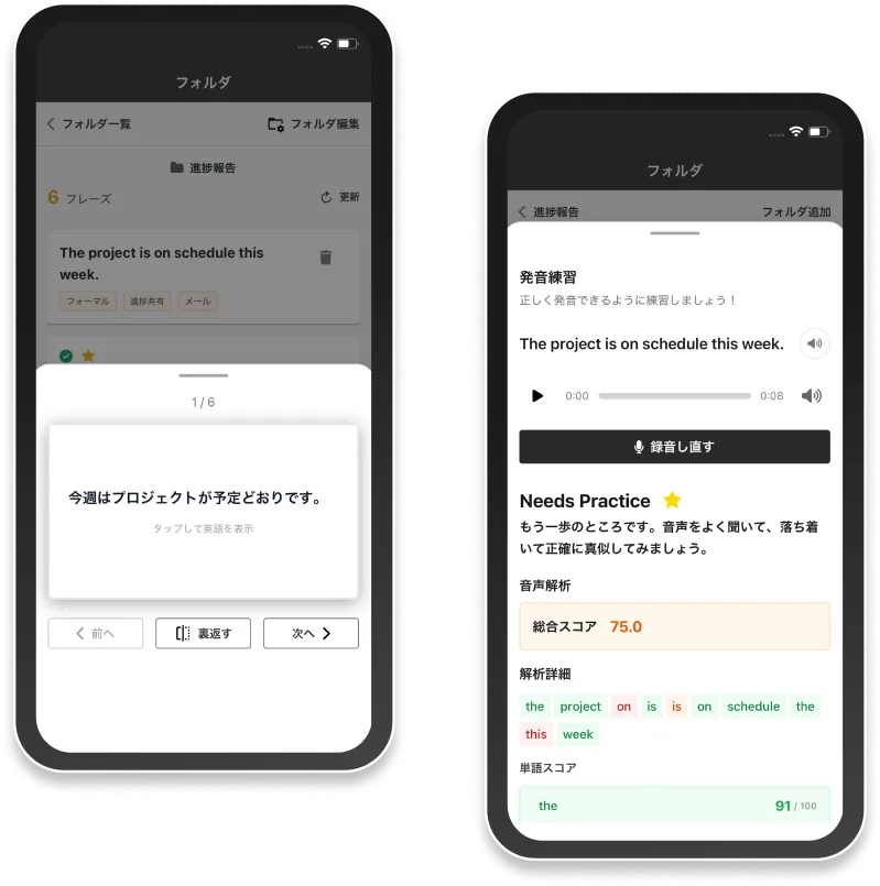 ストックしたフレーズは、自動でフラッシュカードに。発音練習機能や文法解説もあり、「丸暗記」を「自分の言葉(スキル)」に変えます。
